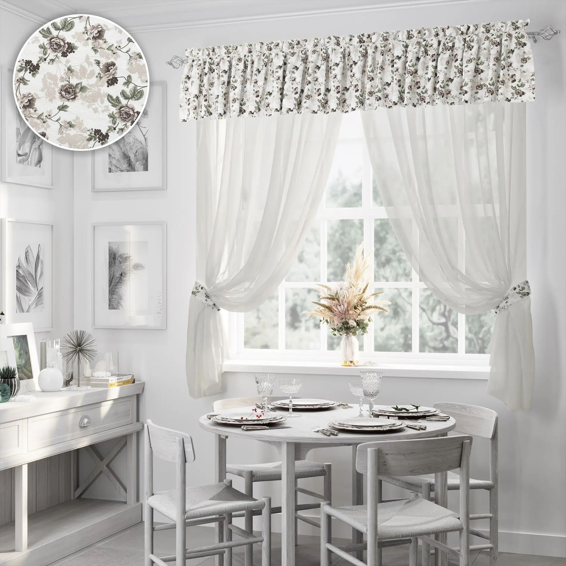 В комплект также входят два подхвата из ткани, аналогичной ламбрекену, что придает шторам завершенный вид.